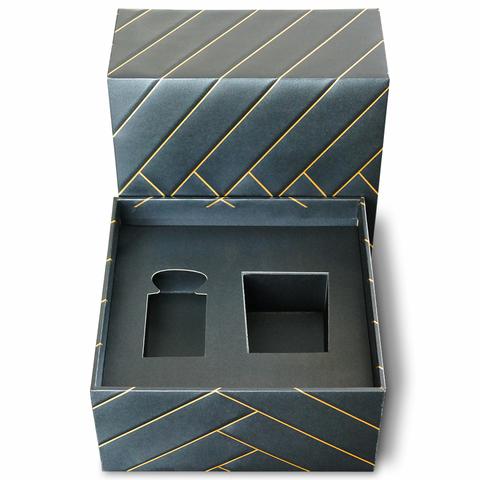 チャコールグレー & ゴールドエンボスパターン香水ギフトボックス、グレーカードインサート付き2個伸縮式、カスタマイズ可能な紙、サイズと色